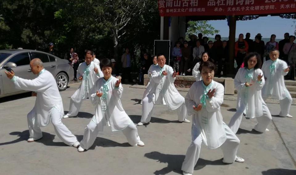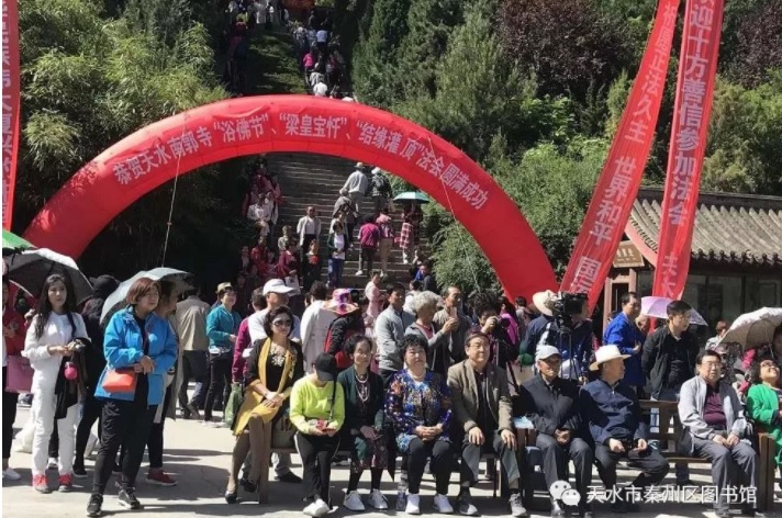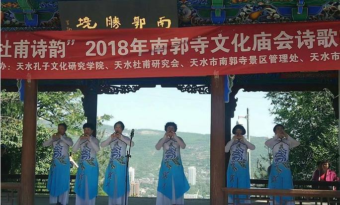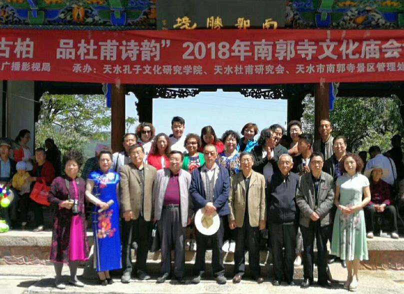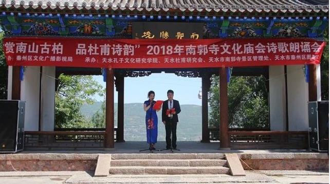 2018年5月22日(农历四月初八),据说这一天是释迦牟尼佛诞,称为浴佛节、佛诞日,也是南郭寺一年一度中最隆重、最热闹的日子,由天水市秦州区文广局主办,天水孔子文化研究学院、天水杜甫研究会、天水市南郭寺景区管理处、天水市秦州区图书馆联合承办的“赏南山古柏,品杜甫诗韵”2018年南郭寺文化庙会诗歌朗诵会,在南郭寺山门下小广场举行。 天水孔子文化研究学院与天水杜甫文化研究会部分领导、理事、会员以及秦州区图书馆工作人员和读者代表参加了这次活动,秦州区文化广播影视局局长秦毅敏致欢迎词,朗诵会正式开始,此次朗诵会主要以咏颂中华经典,弘扬中华传统民族文化为主要内容,汇聚了诗歌朗诵、男女声独唱、葫芦丝演奏、哇呜演奏、二胡独奏、秦腔戏曲唱段及陈氏太极拳表演等14个优秀的节目,表演者们各个精神抖数,声情并茂,为将近一千多位游客观众献上了一场文化大餐,赢得了在场观众们的阵阵掌声和声声喝彩。 此次朗诵会趁着2018年南郭寺文化庙会的契机,进一步推动了“全民阅读--书香秦州”建设,弘扬了中华优秀传统文化,扩大了秦州区图书馆影响力,秦州区图书馆将再接再厉,不断提高图书馆服务能力与服务水平,拓宽服务渠道,做好延伸服务,发挥自身优势,为构建和谐天水,魅力秦州做贡献。